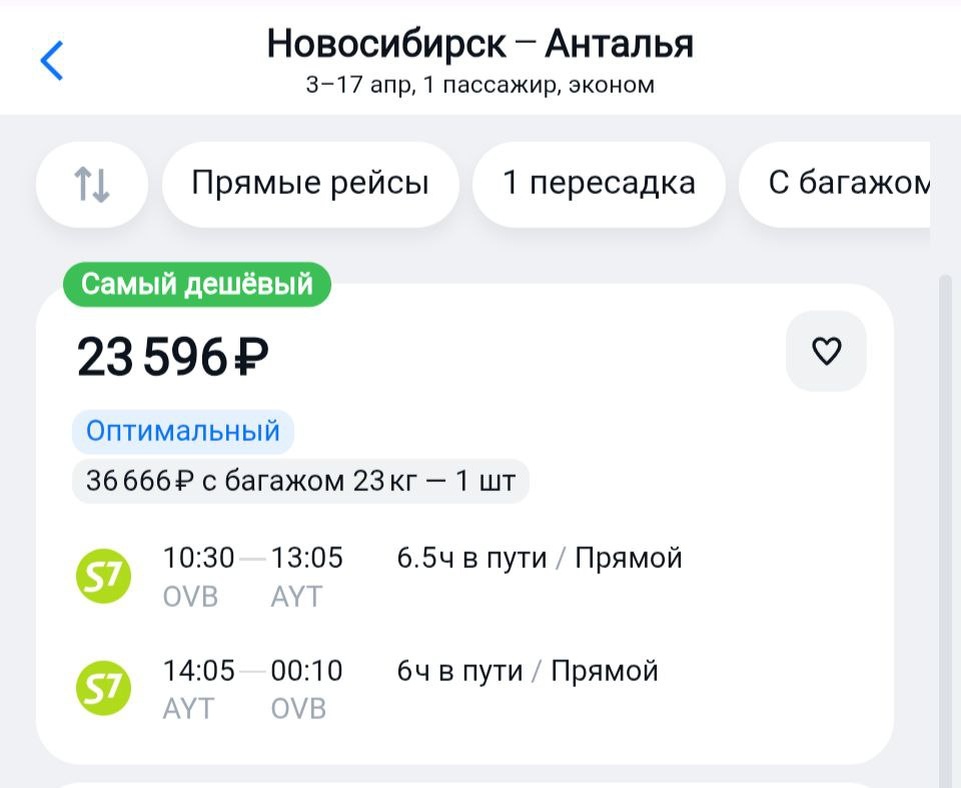 🇹🇷 Турция из Новосибирска на будущий год, распродажа S7: 📌 Из Новосибирска в Анталью в апреле - 23600₽ ↔️ https://aviasales.tpm.lv/0m6ARGzP 📌 Новосибирска в Стамбул в феврале - 21300₽ ↔️ https://aviasales.tpm.lv/jxB8EZxK 📌 Из Новосибирска в Стамбул в мае - 24500₽ ↔️ https://aviasales.tpm.lv/cC1VA4ZG @KJA