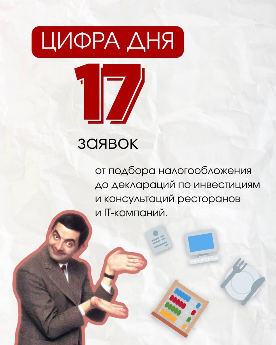 17 заявок — от подбора налогообложения до деклараций по инвестициям и консультаций ресторанов и IT-компаний