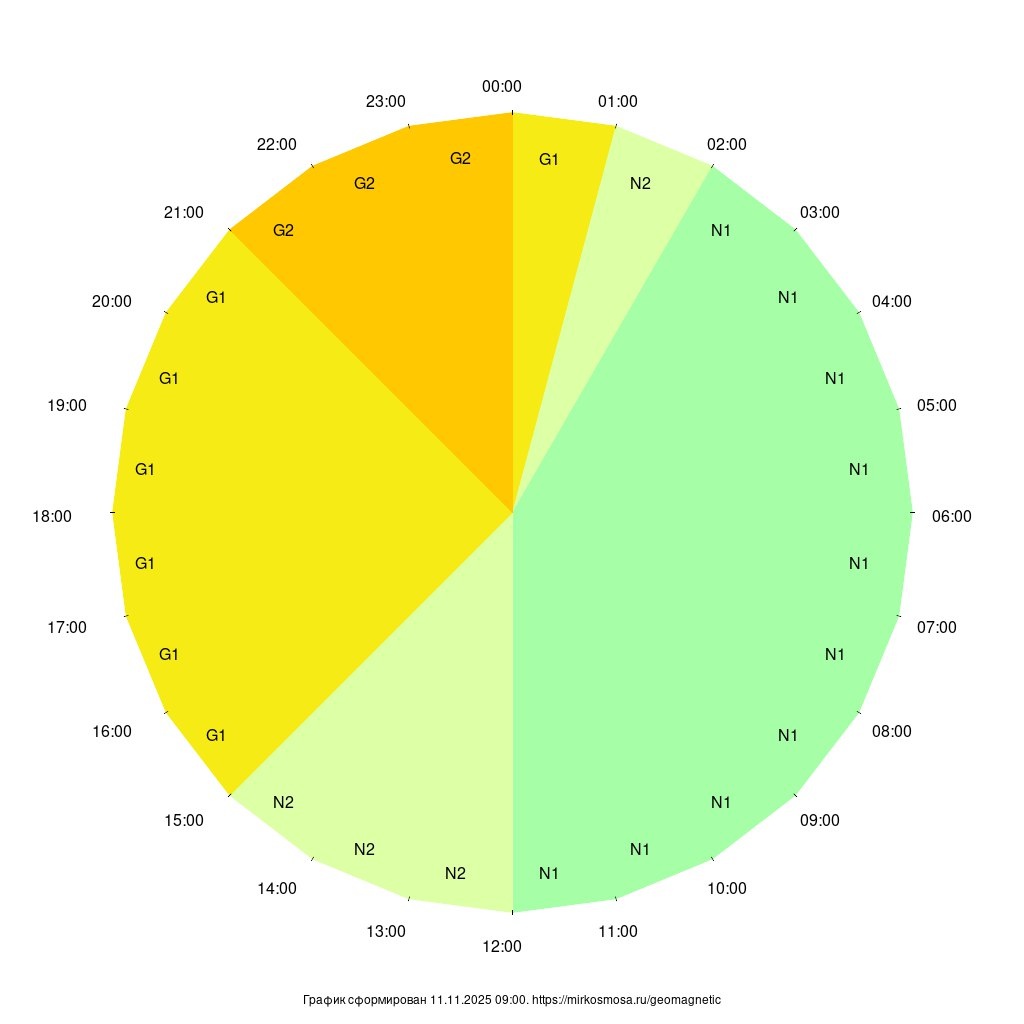 Геомагнитный прогноз на 11.11.2025: ожидается, что с 09:00 до 12:00 геомагнитный фон будет в норме (N1), с 12:00 до 15:00 геомагнитный фон