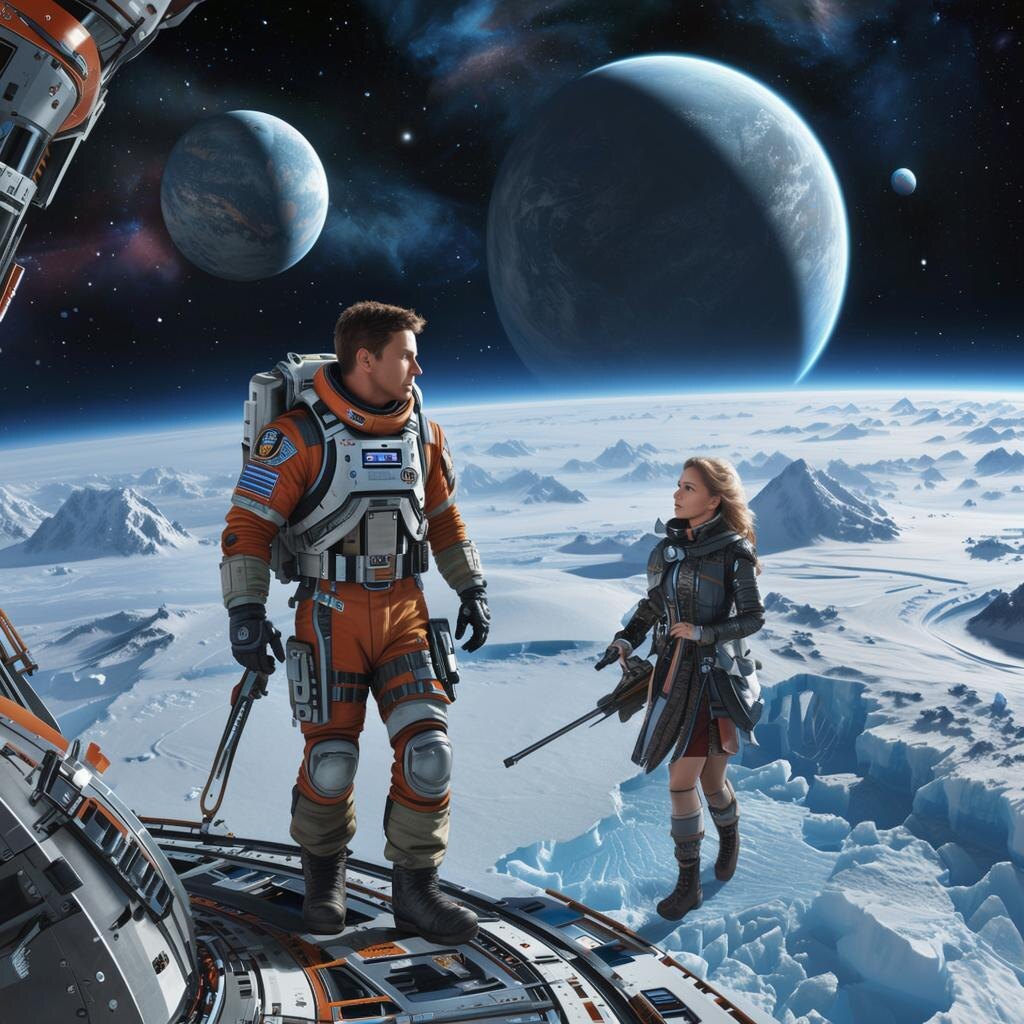 Космический корабль "Заря" мягко опустился на поверхность Нептуна. Атмосфера планеты была плотной и насыщенной метаном, создавая голубое свечение вокруг судна. Илья первым вышел наружу, держа автомат наготове. За ним последовала Йолдыз, вооруженная научным оборудованием.