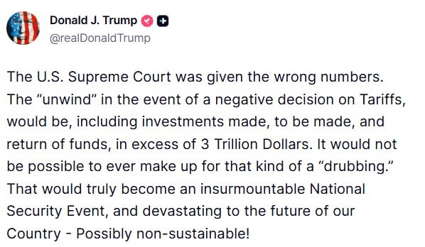 Трамп: Проигрыш в суде по пошлинам обойдется США в $3 ТРЛН! 💸 Действующий президент США Дональд Трамп снова поднял ставки в споре о своих торговых пошлинах! 😮 Он заявил, что если Верховный суд признает его тарифы незаконными, Штатам придется вернуть партнерам более $3 триллионов. Причем вчера эта сумма составляла всего $2 триллиона, так что счетчик растет на миллиард в день! 📈 Эти пошлины оспариваются в судах, где уже есть решения о том, что президент превысил свои полномочия. Если суд встанет на сторону истцов, это может стать огромной финансовой проблемой для бюджета США. Интересно, как скоро этот юридический баттл закончится и чем обернется для мировой торговли. #новости #БезПафосаФинансы #пошлины #суд #торговля