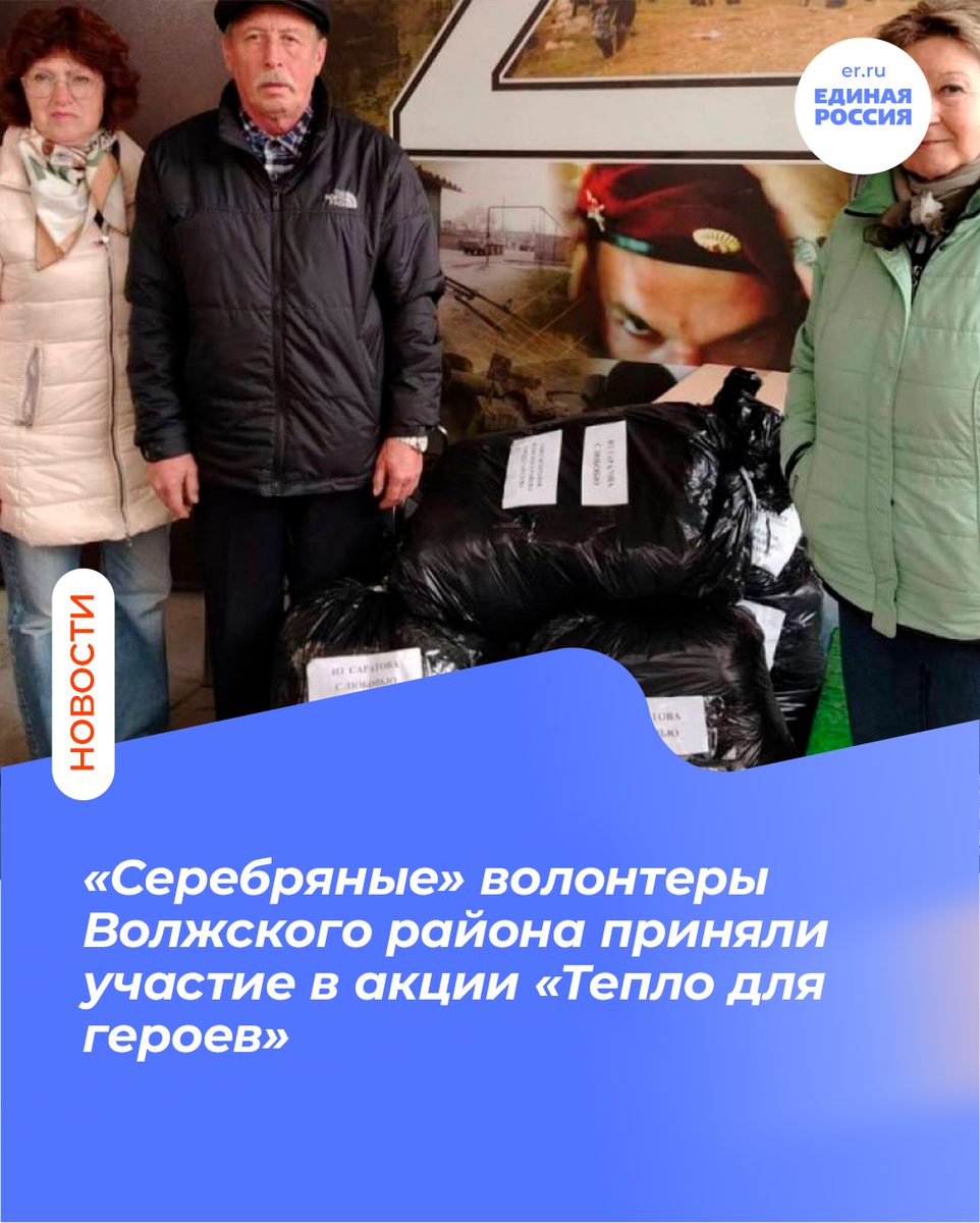 По инициативе местного координатора партпроекта «Старшее поколение» Волжского отделения партии «Единая Россия» Ирины Кочетковой был объявлен старт ежегодной Всероссийской благотворительной акции «Тепло для героя», в рамках которой «серебряные» волонтеры собрали гуманитарный груз для бойцов, находящихся в зоне проведения специальной военной операции.