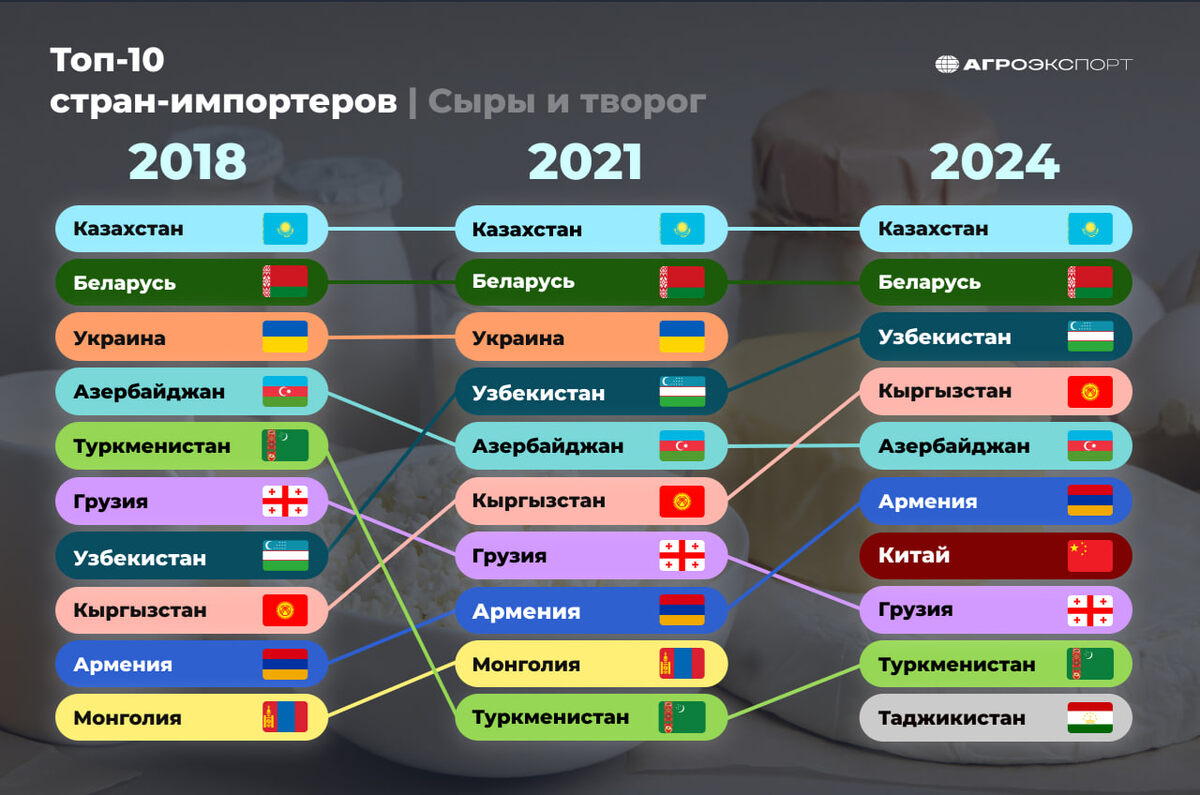Россия в последние годы наращивает объем экспорта сыров и творога на зарубежные рынки. Исключением стали 2022 и 2023 годы, когда экспорт в весе снижался по отношению к предыдущему году. При этом интересно, меняются ли направления поставок, открываются ли новые страны для экспорта или же расширяется сеть контрагентов в проверенных странах? Ответить на эти вопросы мы постараемся сегодня. Итак, на графике представлены: ✅ Основные страны-импортеры российского сыра и творога в натуральном выражении; ✅ Самые динамично растущие рынки; ✅ Новые перспективные направления экспорта. За 8 месяцев 2025 года Россия экспортировала более 21 тыс. тонн сыров и творога на почти 110 млн долл. США. В сравнении с аналогичным периодом прошлого года объем поставок в натуральном выражении остался на том же уровне, а в деньгах вырос на 17%.