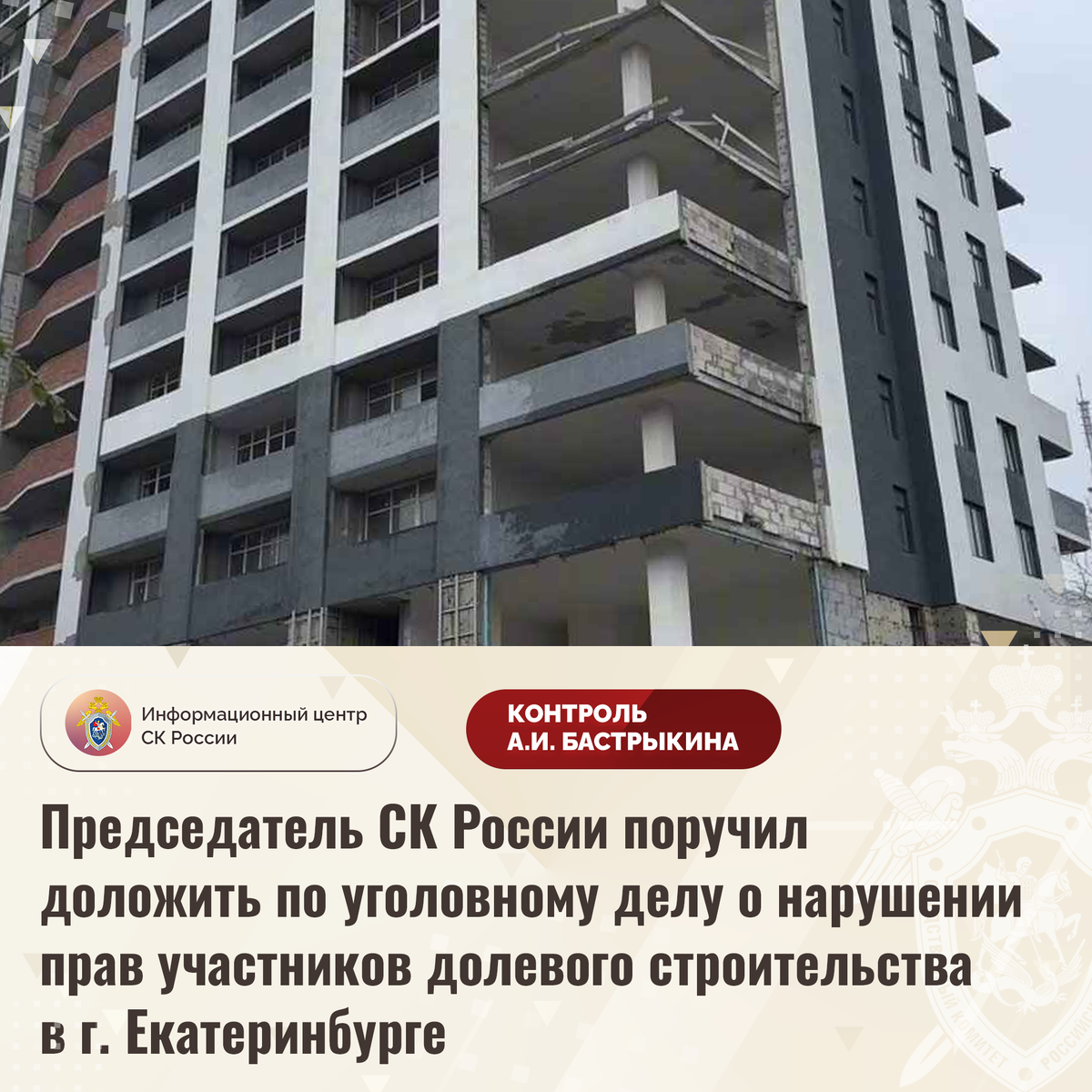 Председатель СК России поручил доложить по уголовному делу о нарушении прав участников долевого строительства в г. Екатеринбурге