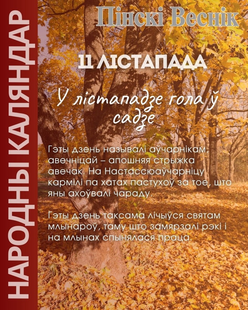11 лістапада 🔸Гэты дзень называлі аўчарнікам, авечніцай – апошняя стрыжка авечак. На Настассюаўчарніцу кармілі па хатах пастухоў за тое, што яны ахоўвалі чараду. 🔸Гэты дзень таксама лічыўся святам млынароў, таму што замярзалі рэкі і на млынах спынялася праца. #народны_каляндар @Пинский Вестник ЮТУБ | САЙТ| ИНСТ | ВК | ОК | ФЕ | Прислать новость