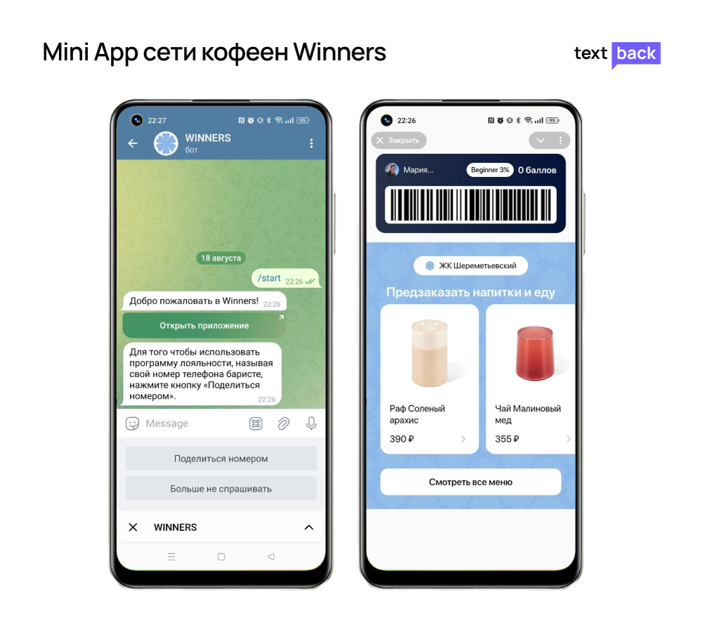 TextBack позволяет быстро создавать Mini App и запускать программы лояльности в Telegram, заменяя приложение и сайт, собирает достоверные данные клиентов, их согласия на работу с персональными данными и на получение рассылок.
