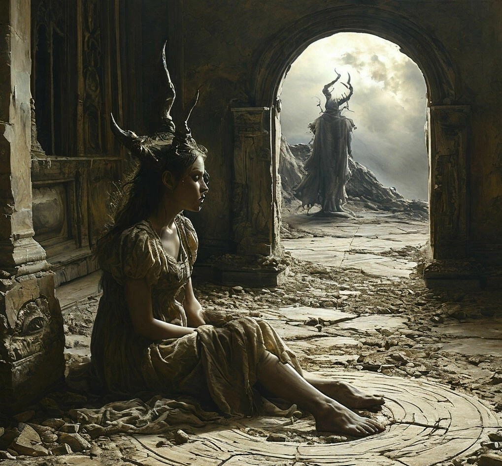 То что я увидела,заставило меня отскочить от двери, и застыть в оцепенении от ужаса. В проём,что ограничивала цепочка, пыталась прорваться женщина, в очень странном, словно потрёпанном, одеянии. У неё были длинные, тёмные волосы, страшное лицо и глаза, в которых были злость и ненависть. Она повторяла слова на непонятном языке, а я понимала их в голове: "Думала сможешь спрятаться?"