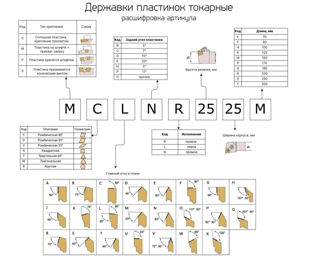 «Купил державку MCLNR2525M на Ozon — а какие пластины к ней подходят?» Или: «В артикуле написано MCLNR2525M — что это за херня? Где найти аналоги?» Это не редкость. Это ежедневная боль для любого токаря, который работает с китайским или «серым» инструментом. В этой статье мы разберем артикул MCLNR2525M по буквам и цифрам, посмотрим что означает каждый символ, и поймем, как подобрать пластины — быстро, без ошибок, без переплат. Артикул токарной державки состоит из букв и цифр, каждая из которых обозначает конкретную характеристику. Возьмём пример: MCLNR 2525M Это тип крепления пластины. → M — значит, пластина крепится на штифте и прихватом сверху. Это один из самых распространённых типов. Это геометрия пластины — угол режущей кромки. → C — значит, пластина ромбическая, угол 80°. Подходит для черновой и получистовой обработки. Это главный угол в плане — угол между режущей кромкой и осью державки. → L — значит, главный угол 95°. Это стандартный угол для большинства операций. Это задний
