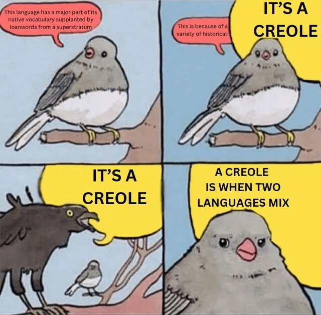 Тему возникновения среднеанглийского языка можно раскрывать и дальше, до крайней рекурсии, но это уже не будет иметь железной связи с темой креольской природы английского языка, поэтому давайте посмотрим на сухой остаток. Заимствовал ли английский язык необычайно много по сравнению со многими другими языками? Пожалуй. Стал ли он проще под их же влиянием? Вероятно. Относится ли современный английский язык к креольским языкам? Нет. Был ли он когда-нибудь креольским языком? Нуууу, нееееет. А если немного поиграться с понятием креольского языка, чтобы оно соответствовало тому, что я считаю правильным? Тогда, вероятно, да, но мы должны отдавать себе отчёт, что при достаточной подкованности и умелости в ментальной акробатике можно доказать и то, что два плюс два равно пять, но кому от этого будет легче?