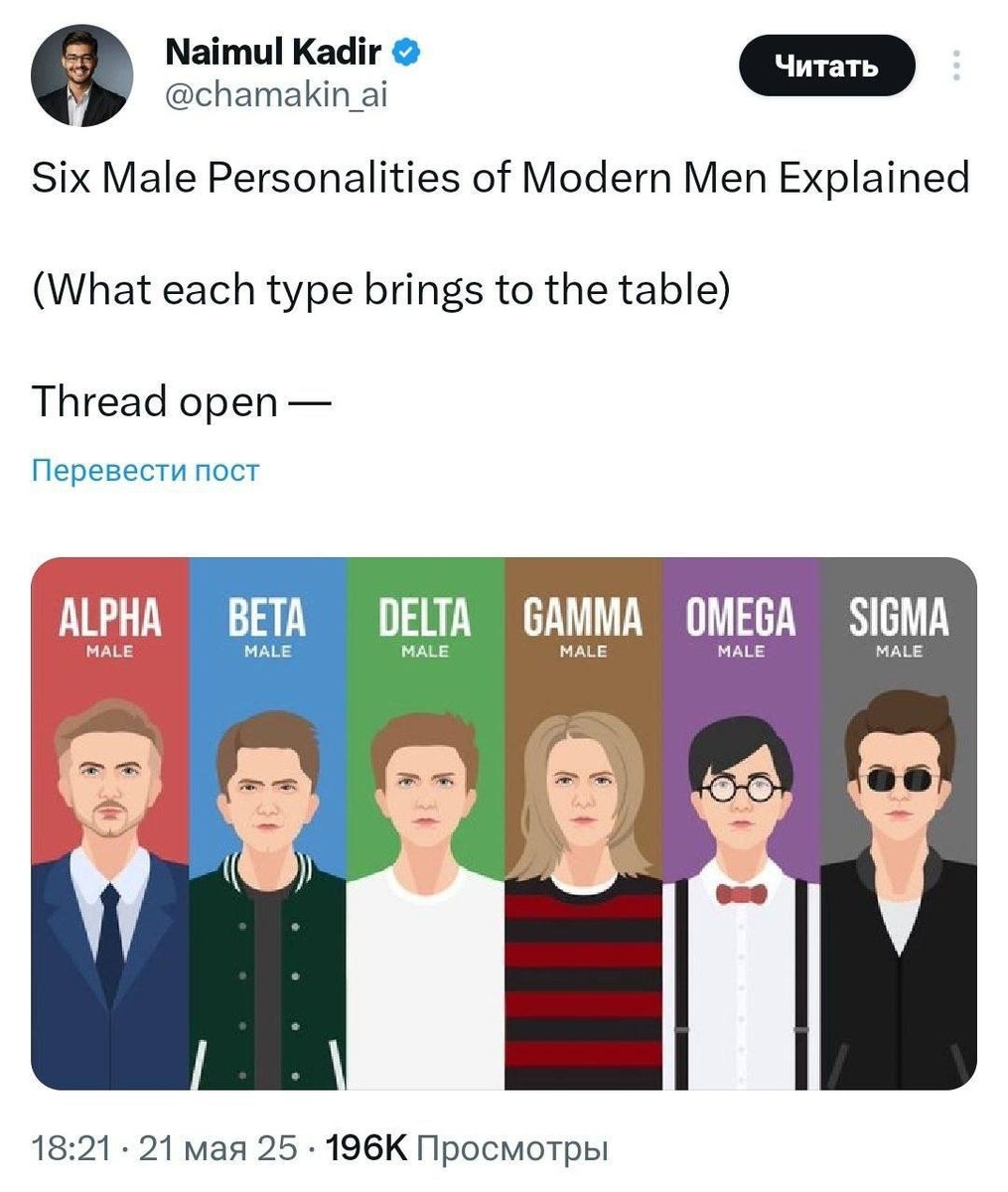 Эта не строго научная, но все же информативная классификация помогает понять, что мужчины бывают разными и у каждого свои особенности. Кто-то предпочитает лидировать, другие поддерживать, третьи и вовсе оставаться в стороне. Важно не столько подстраиваться под какую-то роль, сколько осознавать свои сильные стороны и жить в согласии с собой. Многие нашли в этих образах себя или друзей, обсуждая и шутя в соцсетях.