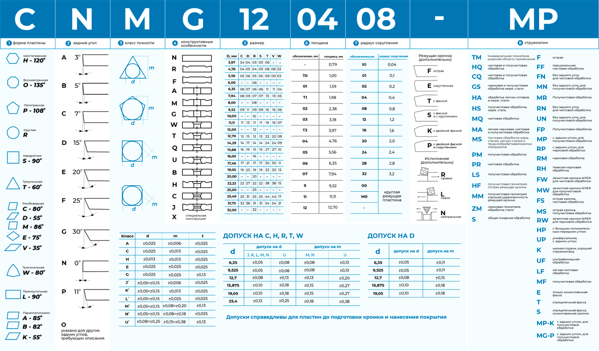 Любой артикул токарной пластины состоит из 8 символов (иногда с дополнительными буквами). Разберем их по порядку на примере: CNMG 120408 MP.