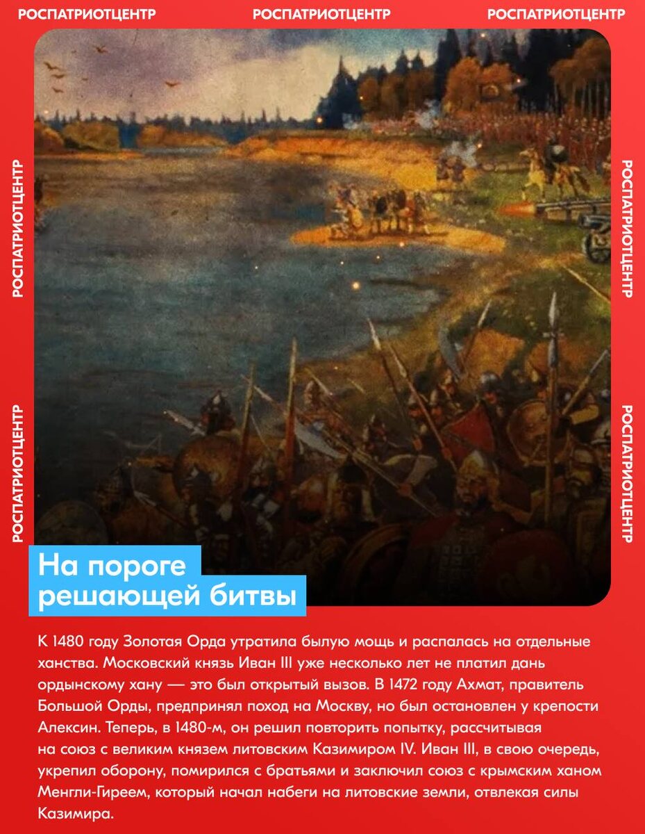 Легендарное Стояние на Угре 💬 11 ноября, ровно 545 лет назад, благодаря мудрости полководцев и силе духа воинов, Русь полностью освободилось от Большой Орды. Какой князь объединил войска? Почему именно Угра? Как хан отступил без решающей битвы? 🤔 Рассказали в карточках ⤴️ ❤️ Роспатриотцентр I Подписаться