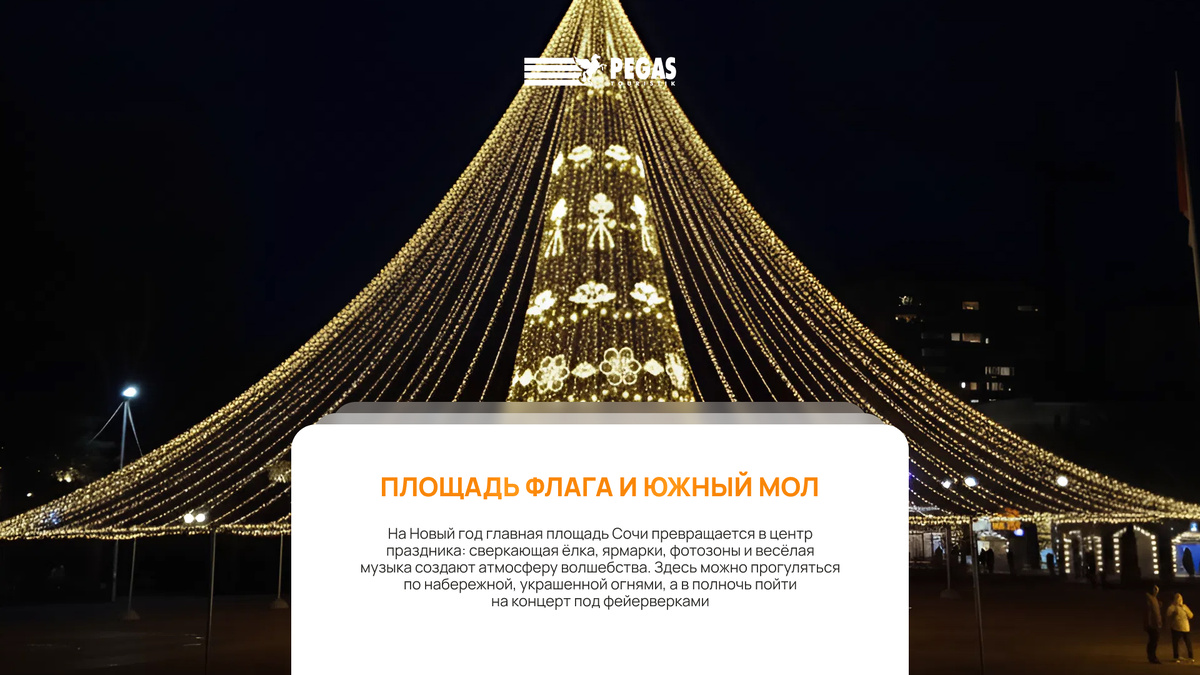 Зима в Сочи особенно привлекательна: утром вы гуляете по набережной в лёгкой куртке, дышите морским воздухом и пьёте кофе с видом на волны, а уже через пару часов — спускаетесь по заснеженным склонам Розы Хутор или Красной Поляны. Именно за это сочетание туристы так любят Сочи. Это город, где можно ощутить зимнюю сказку без сурового мороза и при этом встретить Новый год по-настоящему ярко. В этой статье мы подскажем, чем можно заняться в Сочи в новогодние праздники. В праздничные каникулы здесь скучать просто невозможно: везде шумят концерты и шоу, открыты катки, проходят ярмарки, вечеринки и театральные постановки. Ну, а главный плюс, во всех смыслах, в погоде — в городе температура редко опускается ниже нуля, а в горных районах держится средняя температура в горах от -3 до -8°С. Площадь Флага и Южный мол На Новый год главная площадь Сочи превращается в центр праздника: сверкающая ёлка, ярмарки, фотозоны и весёлая музыка создают атмосферу волшебства. Здесь можно прогуляться по набереж