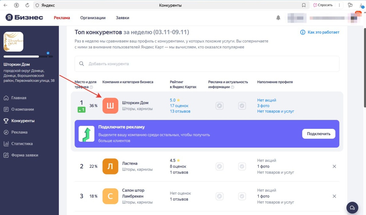 Как вывести карточку в лидеры на Яндекс.Картах в ДНР Да, это реально. Даже в Донецке и Макеевке Яндекс уже активно показывает местные компании. Пока конкурентов немного — самое время занять топ. Посмотрите на пример: «Шторкин Дом» ⭐️ Рейтинг — 5,0 💬 17 оценок и 13 отзывов 📸 3 фото 📍 Категория: шторы, карнизы Карточка держится в топ-1 по городу, хотя реклама не включена. Всё за счёт системного заполнения и отзывов. Что помогает выйти в лидеры: 1️⃣ Полное заполнение — адрес, телефон, режим, описание, фото фасада и продукции. 2️⃣ Отзывы — от 10 штук с ответами владельца. Это сильный сигнал Яндексу. 3️⃣ Фото — добавляйте новые регулярно. Даже если модерация задерживается — активность всё равно считается. 4️⃣ Точные категории — правильный выбор рубрики = больше показов по запросам. 5️⃣ Активность — карточка должна «жить»: публикации, новости, ответы клиентам. Дополнительно: можно подключить баннеры и промокоды для сайта; добавить рекламу в Яндексе, чтобы закрепить лидерство; офо