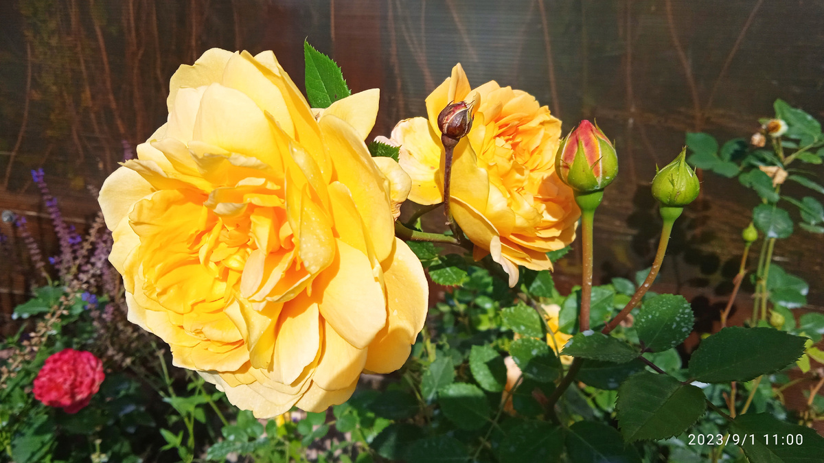 Роза Голден Селебрейшн. Золотая Звезда Сада: Моя Упрямая Розочка. Селекция1992: Ко мне она забрела 13 лет назад — как классический пересорт в коробке, типа "ой, не та роза, но берите, не пропадать же!". С тех пор она моя садовая знаменитость Куст: Пышный, Как Вечеринка в Саду! Эта роза — настоящая сила природы! Куст мощный, раскидистый, обильно цветущий, с побегами длинными и изогнутыми, которые поникают, словно говорят: "Эй, подвинься, я тут главная!". Опора? Обязательна, иначе она устроит "танец под луной" и упадёт. Обещанный размер — 120–150 см, но в тёплом климате она тянется выше, как подросток на первом свидании. Южане её даже как плетистую выращивают — круто! Моя всегда была такой грациозной, пока зима 2022 не решила поиграть в снежки: дуги сломались, розы