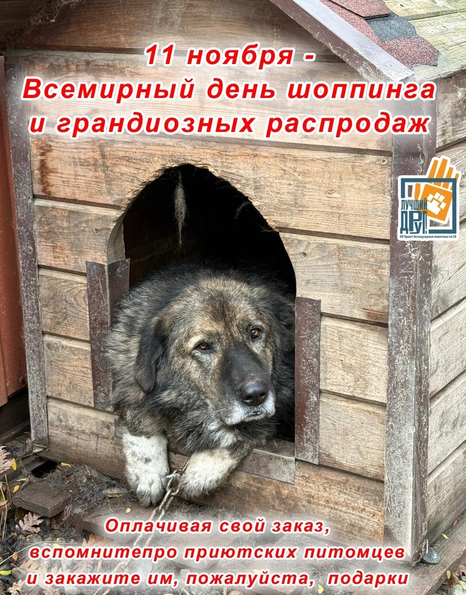 11 ноября ежегодно во всем мире отмечается неофициальный праздник — Всемирный день шопинга и он же всемирный день скидок! Все крупные (и многие не очень крупные) оффлайн и онлайн-магазины, маркетплейсы устраивают грандиозные распродажи почти на все товары. В этот день многие люди готовы потратить достаточно большие суммы на покупку понравившихся вещей. Приютские животные будут благодарны, если, делая заказ для себя, вы закажете подарки и для них. Список постоянных нужд всегда можно найти по ссылке ld26.ru/hochu-pomo...
