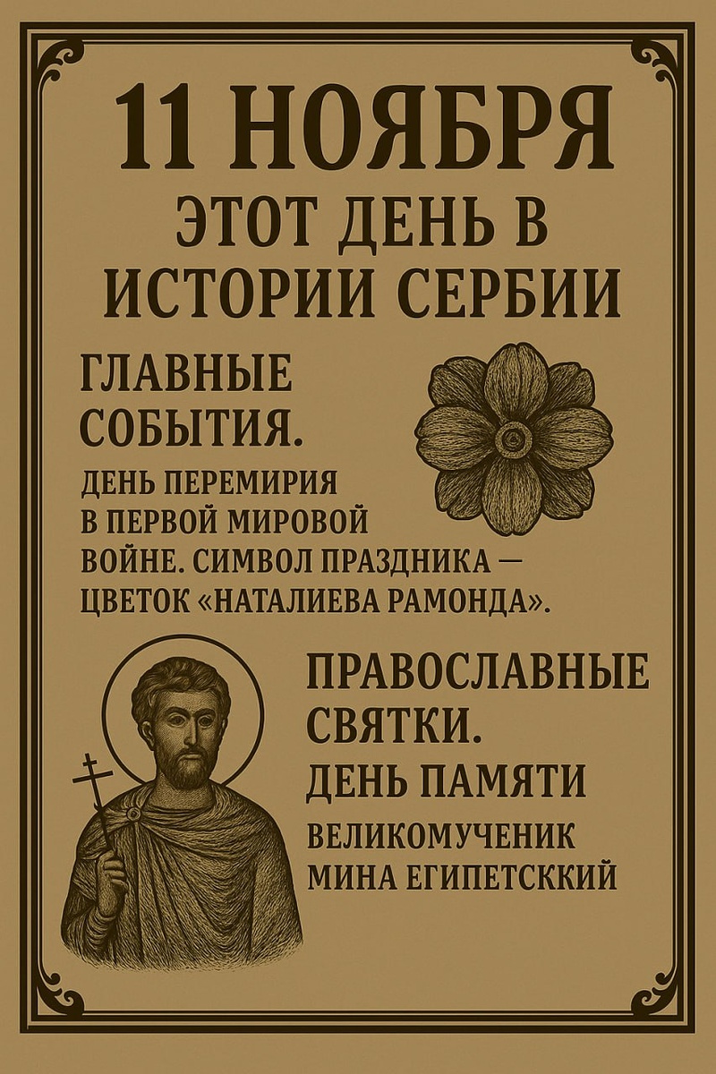 Этот день в истории Сербии — 11 ноября Главные события. День перемирия в Первой мировой войне — государственный праздник Сербии, отмечаемый 11 ноября с 2012 года. Символ праздника — цветок «Наталиева рамонда» в сочетании с лентой Албанской памятной медали; дата является выходным днём. Дни рождения. Выдающиеся деятели (Сербия). 1948 — родился Душан Прелевич (Преле), сербский певец, журналист и писатель (Белград). 1971 — родился Горан Джорович, сербский футболист и тренер, защитник сборной Югославии/Сербии. Православные святки. День памяти. Великомученик Мина Египетский; мученики Виктор Дамасский и Викентий Испанский; мученица Стефанида; Преподобный Феодор Исповедник, игумен Студийский; Преставление святого Стефана Дечанского, короля Сербии. Международные даты (ООН и др.). День перемирия (Armistice Day) — напоминает о прекращении огня 11.11.1918; отмечается в ряде стран, в т. ч. в Сербии. День памяти павших (Remembrance Day) — в странах Содружества. День ветеранов в США (Vet