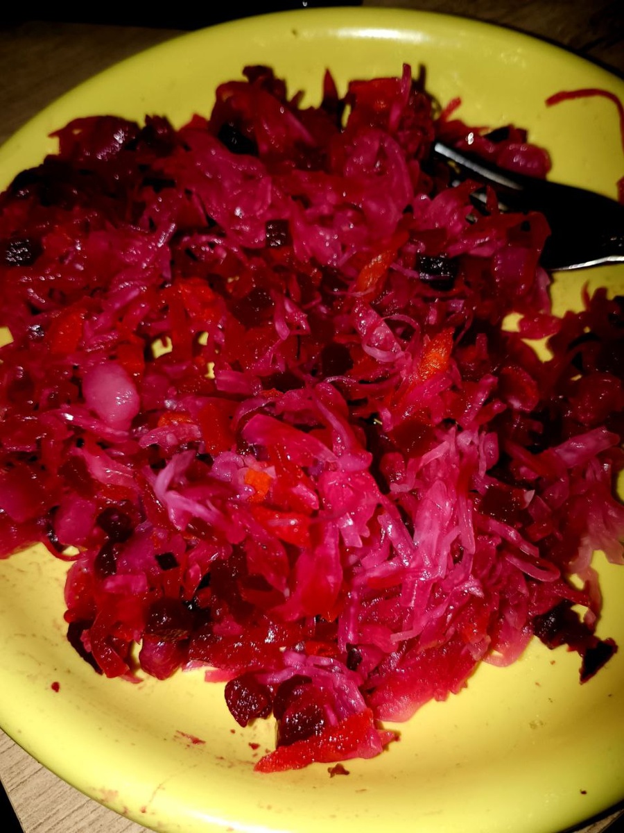В старом эмалированном тазике собрались путешественники. Свёкла – в пурпурном плаще, картошка – в добродушном пыльном пальто, морковь – как яркий факелоносец, огурцы солёные – шуточники с искрой в глазах, лук – строгий критик, зелёный горошек – россыпь смеха, а квашеная капуста – мудрая крошка с кислым юмором.