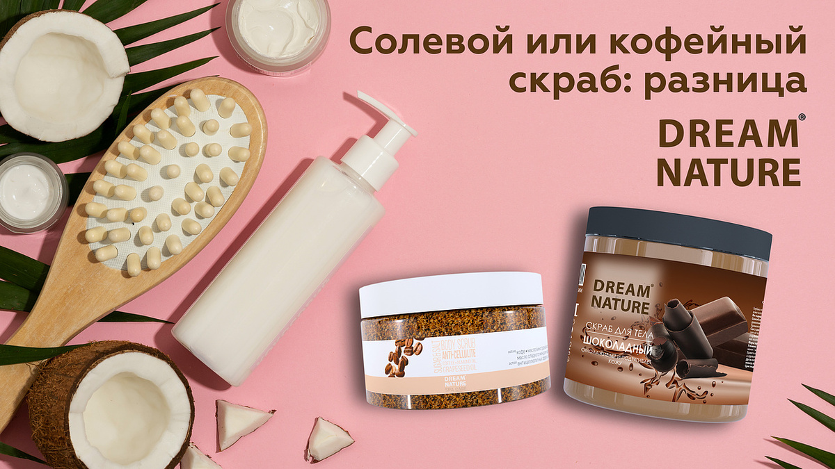 Чтобы не потеряться в разнообразии баночек и правильно подобрать скраб под свои цели, скорее читайте наш материал. Скрабы на основе соли обычно имеют более грубую текстуру, но это не минус, а суперсила! Она обеспечивают глубокое отшелушивание, а частицы соли отлично выводят токсины, что делает солевые скрабы идеальными для жирной и огрубевшей кожи. Например, для локтей и пяток стоит выбрать именно их. Обладателям чувствительной кожи с такими скрабами стоит быть осторожнее, кофейные в таком случае будут уместнее и обеспечат щадящее воздействие. При правильном использовании такой вид скраба подойдёт для всех типов кожи за счёт своей мягкой текстуры. Солевые скрабы – борцы с проблемными зонами, а кофейные воздействуют на тонус и упругость кожи. При выборе средства отталкивайтесь от вашего типа кожи и потребностей. Какой скраб выбрать? В основе антицеллюлитного скраба DREAM NATURE – кофе, масло виноградной косточки, масло сладкого миндаля, цедра апельсина. Молотые кофейные зерна в его сост