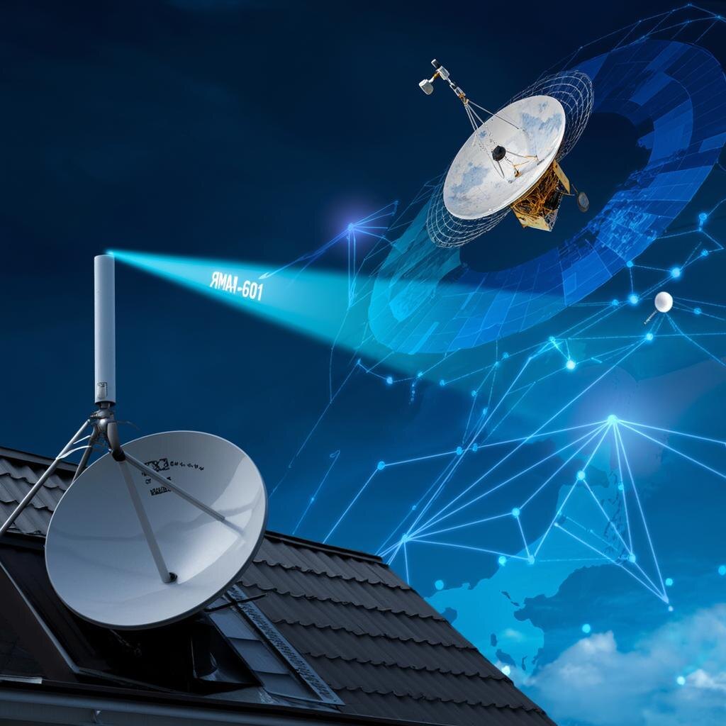 - Спутник Ямал-601 принимает сигнал, усиливает его и перенаправляет на наземную станцию провайдера услуг спутникового интернета.