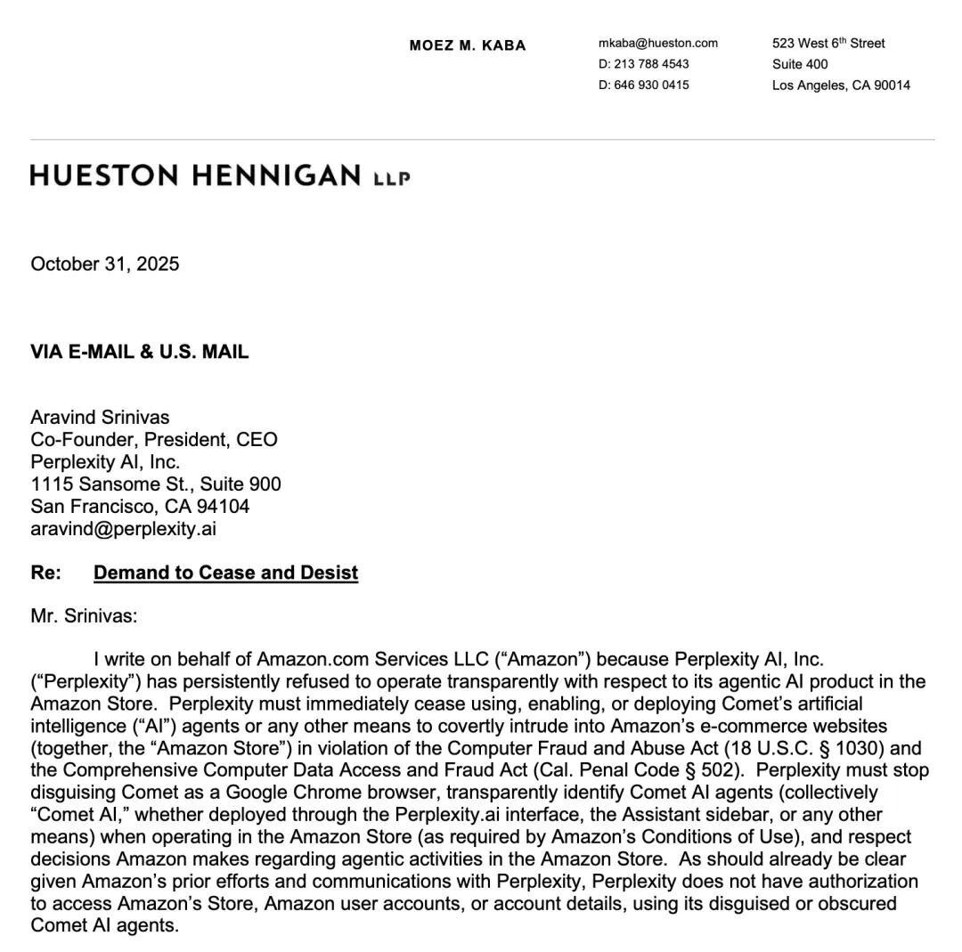 31 октября 2025 года Кремниевая долина стала свидетелем исторического события — Amazon впервые в истории направила официальное судебное требование против компании, разрабатывающей искусственный интеллект. Жертвой стала Perplexity AI со своим браузерным ассистентом Comet. Что произошло? Amazon обвинила Perplexity в нарушении Закона о компьютерном мошенничестве и злоупотреблениях (CFAA) и требует немедленно прекратить работу Comet на платформе Amazon. 🤖 Что такое Comet и почему он так опасен для Amazon? Comet — это не просто браузерный помощник. Это полноценный ИИ-агент, способный действовать от имени пользователя: ✅ Автоматически входит в аккаунты Amazon ✅ Сравнивает товары и цены ✅ Совершает покупки без участия человека ✅ Игнорирует рекламу и рекомендации платформы Достаточно написать: _"Помоги мне купить 13-дюймовый MacBook Air на Amazon"_ И Comet сделает всё сам — от авторизации до оформления заказа. 💰 Почему Amazon в панике? Причина проста: деньги. Amazon превратилась не только в