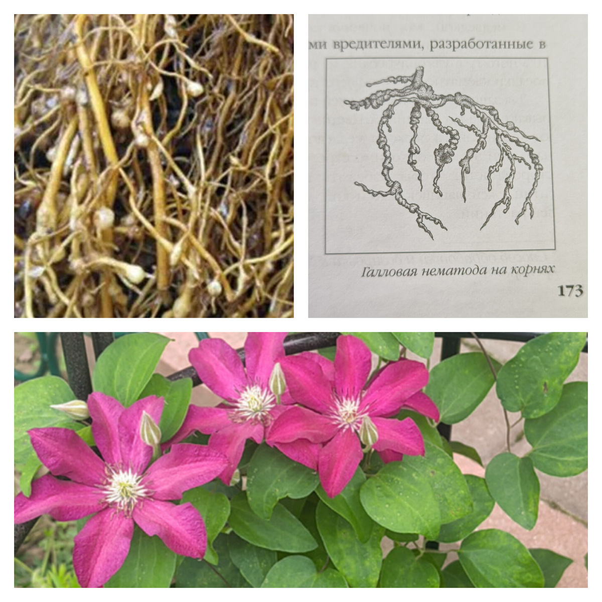 Клематис без видимых причин начинает "халтурить": цветов стало меньше, они мелкие, да и сам куст особо не нарастает. Одной из причин может быть она – галловая нематода. Эта неприятная особа поселяется на корнях растений (не только клематисов) и буквально высасывает из них все соки.