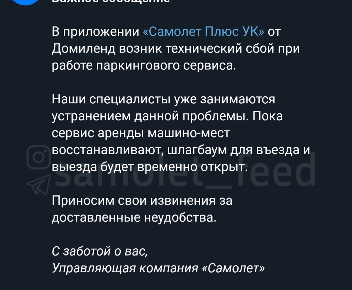 В ответ на пост УК "Самолет-Сервис" сослался на "технический сбой" в приложении "Самолет Плюс УК" и пообещал исправить ситуацию с парковками до конца сегодняшнего дня. "Технический сбой" наблюдают только соседи чьи дома перешли в УК "Азимут". ________ Присылать новость @mstislavz 👉 Обсудить в чате ЖК 👉 Подписаться на канал
