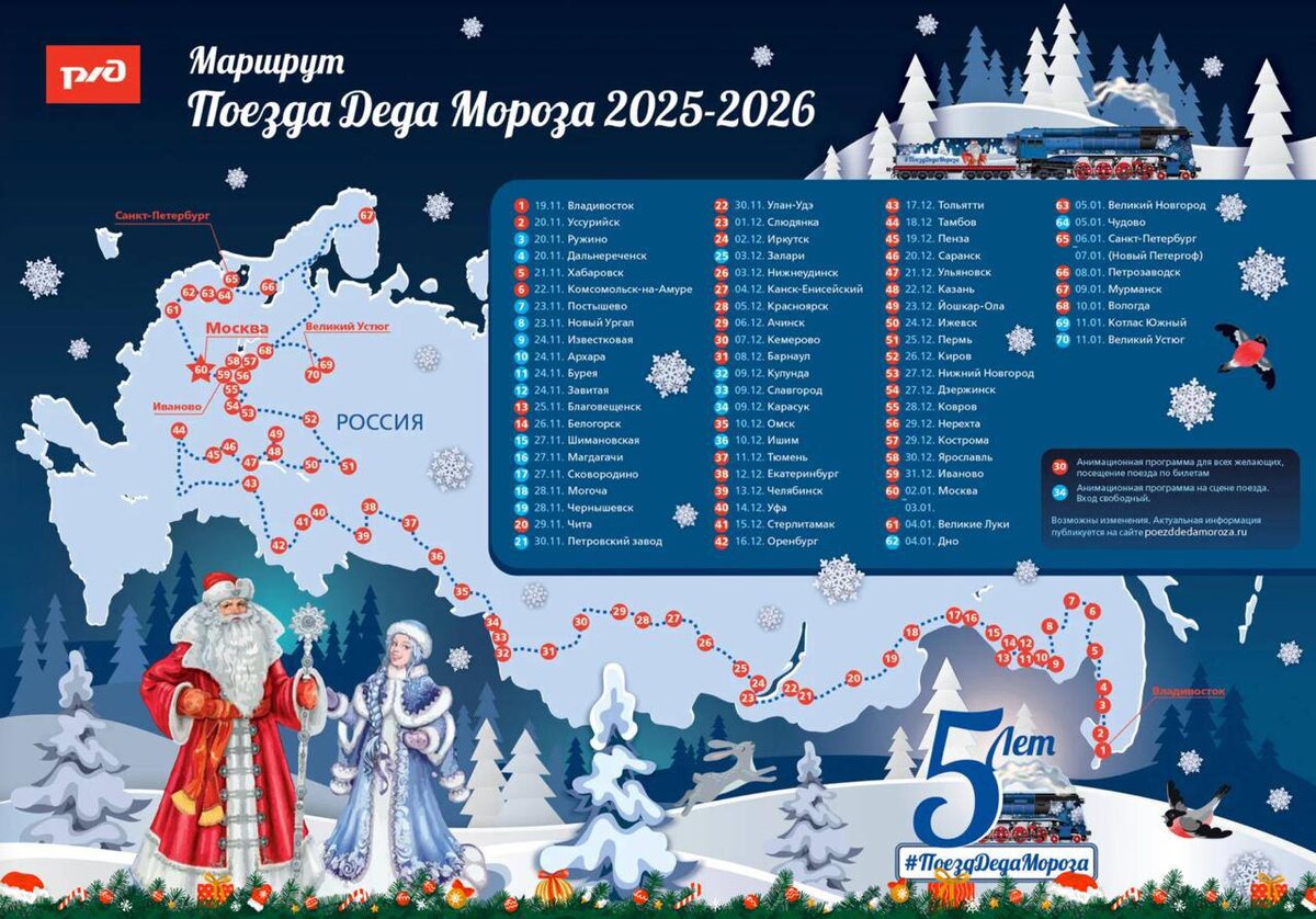 РЖД анонсировали расписание поезда Деда Мороза 2025-2026 — оно опубликовано на poezddedamoroza