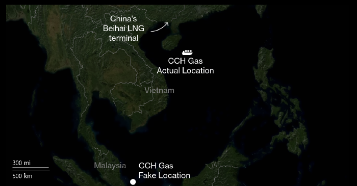 Это говорит о том, что Пекин наращивает усилия по закупкам данного вида топлива, пишет Bloomberg. На карте отмечены (сверху вниз): китайский СПГ-терминал Бэйхай, реальное местоположение СПГ-танкера CCH Gas, и его фейковое местоположение. Данные: SynMax, источник: Bloomberg. Танкер с подсанкционным российским сжиженным природным газом (СПГ), скрывавший свое местоположение, был замечен у побережья Китая, сообщает компания SynMax. Это говорит о том, что Пекин наращивает усилия по закупкам данного вида топлива. По данным SynMax (занимается спутниковой аналитикой), судно CCH Gas, зарегистрированное на владельца из Гонконга, было обнаружено в понедельник к юго-востоку от острова Хайнань на юге Китая. С конца октября корабль передавал сигналы, указывавшие на его нахождение у восточного побережья Малайзии, по-видимому, «подделывая» свои координаты, что является распространенной тактикой «теневого флота». Как показал анализ Bloomberg, сделанные в воскресенье спутниковые снимки также зафиксирова