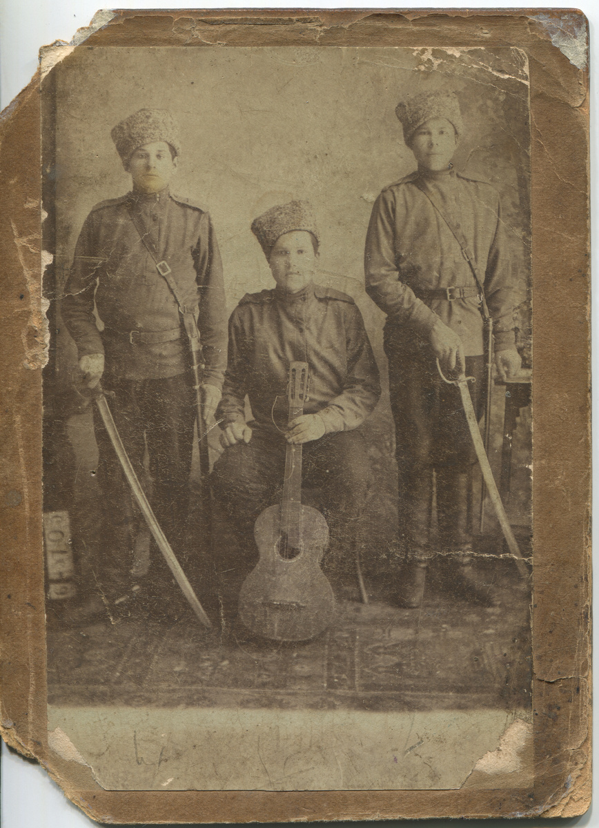 Это последний пост в тематической неделе. Первая мировая война оставила след и в истории моей семьи. В старом фотоальбоме хранится фотография, на которой запечатлен мой прадед Андрей Васильевич Попов, тот самый про которого я уже писал, он был гончаром в селе Троицкое Новохоперского уезда. Вообще в семье не осталось каких-то воспоминаний или рассказов о его военной службе в годы Первой мировой войны. И только фотография остается безмолвным свидетелем этого. Андрей Васильевич Попов на фотографии стоит слева, вместе с ним односельчане Маклаков (сидит в центре) и Поспельный (справа). Год съемки – 1916, надпись карандашом на обороте почти выцвела. Для того, чтобы получить новые сведения, размещал фотографию на форуме Всероссийское генеалогическое древо и обращался к специалистам по униформе русской императорской армии. Удалось установить следующее: пушечные стволы на погонах (Илл. 2), шашки и шпоры (Илл. 3) указывают на артиллерию. Кроме того, черные шаровары продолжали носить в артиллери