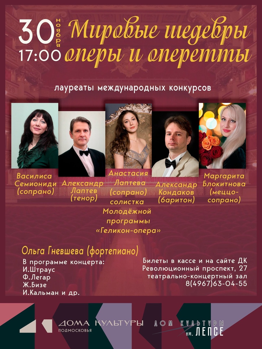 ✨ Концерт "Мировые шедевры оперы и оперетты"🎶 Вас ждет незабываемое путешествие в мир музыки, где вы услышите самые известные произведения великих композиторов. 💖 На сцене выступят лауреаты международных конкурсов, мастера сцены: 🔹Анастасия Лаптева (сопрано) - солистка Молодёжной программы Московского музыкального театра «Геликон-опера» 🔹Василиса Семиониди (сопрано) 🔹Александр Лаптев (тенор) 🔹Маргарита Блокитнова (меццо-сопрано) 🔹Александр Кондаков (баритон) 🔹Ольга Гневшева (фортепиано) 🚫 Возраст: 0+ 📆 30.11.2025 🕒 17:00 🏢 Дом культуры им. Лепсе 📍 г. Подольск, Революционный просп., 27 🎫 Купить билет: vk.cc/cQXrUg ⭐Поддержать канал голосом 💰 Вакансия - курьер в Подольске ✅ Мероприятия Подольск https://dzen.ru/id/66ed500f7b5671493eca3fd6 http://vk.com/podolsk_events http://dzen.ru/podolsk_events