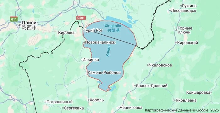 Самое большое в Приморье озеро — Ханка, располагается в центре Приханкайской низменности. При этом северная его часть — примерно 28 процентов общей площади озера, находится в пределах Китайской Народной Республики. Площадь водного зеркала Ханки непостоянна и вместе с уровнем воды периодически колеблется со средней продолжительностью цикла в 26 лет. При высоком уровне она составляет 5010 кв. км, при среднем – 4070 кв. км и при низком 3940 кв. км. Разница между максимальным и минимальным уровнями может при этом превышать 2 м. Длина озера при среднем многолетнем уровне равна 90 км, наибольшая ширина – 67 км. и это делает Ханку крупнейшим пресноводным водоемом не только Примрья, но и всего Дальнего Востока. На западном берегу озера, у границы с Китаем находится старейшее в Приморье российское поселение поселок Турий Рог (1858). Несмотря на то, что в озеро впадают около 20 рек и речек, а вытекает лишь одна (р. Сунгача), оно мелководно. Средняя глубина не превышает 4,5 м, а максимальная – у