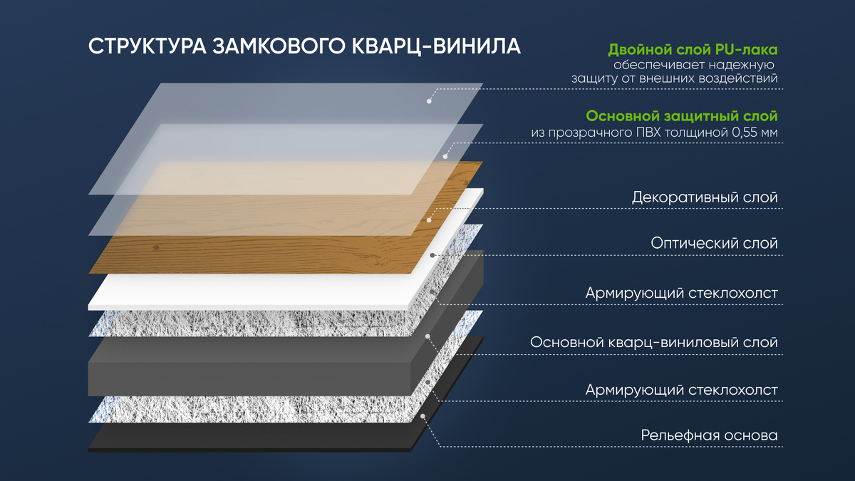 Кварц-винил — это эластичное многослойное покрытие в виде отдельных плашек, в основе которого — сочетание поливинилхлорида и минерального наполнителя.