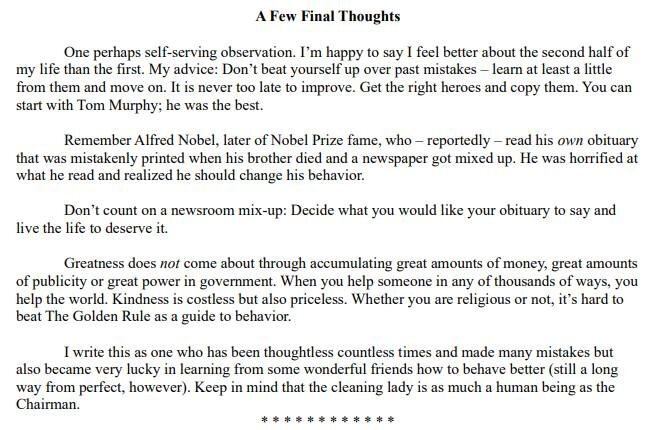 Несколько финальных мыслей Баффета Читаешь последние строки его письма — и становится ясно, почему он дожил до 94-х не только с миллиардами, но и с лёгкостью в голосе. Он пишет просто, без пафоса, но каждое слово попадает в точку: «Не бейте себя за прошлые ошибки — учитесь на них. Никогда не поздно стать лучше. Найдите правильных героев и копируйте их.» Это человек, у которого под управлением триллионы, а он советует искать героев, а не акции. Начать с Тома Мерфи — «он был лучшим». Дальше Баффет вспоминает историю Нобеля — того самого, кто создал Нобелевскую премию, потому что однажды прочитал свой собственный некролог, где его назвали торговцем смертью. И тогда он решил изменить жизнь. Баффет говорит: не ждите ошибку редакции — сами решите, что бы вы хотели прочитать о себе в финальной статье, и живите так, чтобы это было заслуженно. Он добавляет: величие не приходит от власти и денег. Оно рождается, когда вы помогаете другим. Доброта бесплатна, но бесценна. И заканчивает тихо,