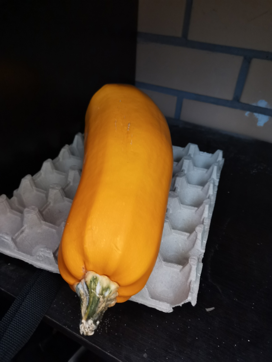 Или не на балконе. Я серьезно. Ну знаете, бывает что в доме одномоментно куча яблок, кабачков, каких-то там тыкв, прочей вот этой ерунды. И если разложенные по коробкам помидоры съедятся в течение считанных дней, ну у меня по крайней мере, то с кабачками такой фокус не прокатит. А всегда очень обидно когда ты его берешь, предвкушая, а оно в руках расползается, потому как все сгнило уже. Не, можно там какие-то ящики конструировать, вытирать там насухо, прочей ерундой заниматься - но мне лень. Я по-простому. Ну сторонник чтобы по-простому. А по-простому наш главный враг какой? Влажность. Вода. Значит надо чего? Надо чтобы стекала. Значит надо чего? Чтобы лежало на чем-то так, чтобы могло стекать. Ну и вот, чего лучше чем картонка из-под яиц то? Собственно скоро заморозки, я и полез за последним оставшимся кабачком. С немалым раздражением, потому как я отчего-то не люблю желтые. Но семья одобряет. так что приходится. Ну и вот, не сгнил, не потек, минус на балкон, конечно, не проник - но