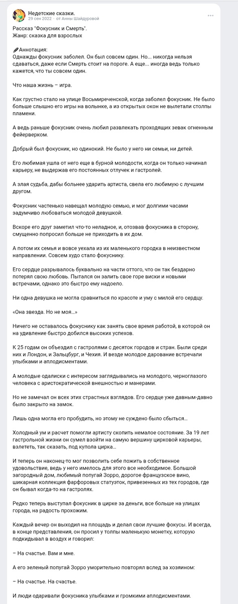 1. Рассказ «Фокусник и Смерть» группа ВК «Недетские сказки».