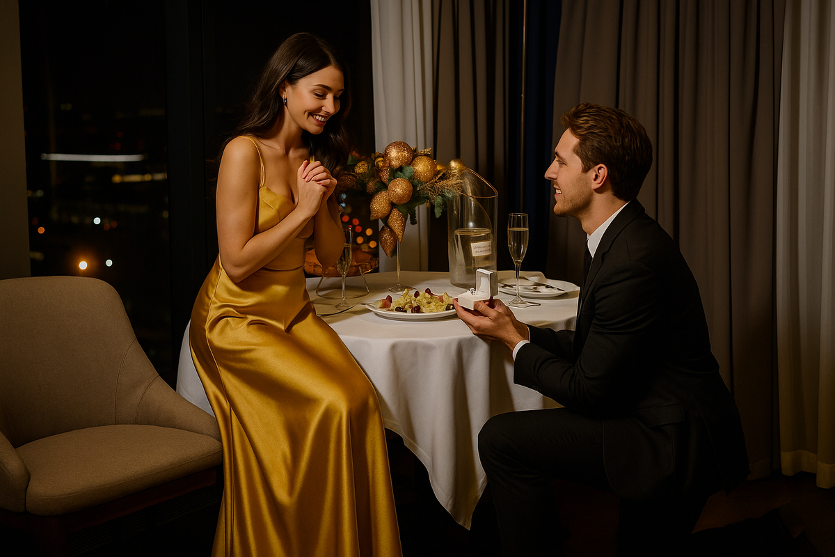 Этим вечером на высоте большого города, который был укутан в снежное покрывало, одна пара готовилась к самым большим переменам в своей жизни. Их сердца бились в такт бесконечных мерцающих огней и трепетно замирали в ожидании начала чего-то нового ✨ В этом волшебном мгновении, когда они держались за руку, а до боя курантов оставалось несколько минут, казалось, что в мире есть только они вдвоем, словно в зимней сказке. Как здорово, что сегодня можно было оставить все заботы позади и вместо суеты насладиться друг другом, запаковать подарки под новогодний плей-лист, заказать в номер любимые блюда в красивой сервировке и просто никуда не спешить. Оставалось всего несколько мгновений, а влюбленные не могли вспомнить, когда последний раз чувствовали себя такими легкими и наполненными. Пахло мандаринами и хвоей, номер отеля был стильно украшен гирляндами, а возле маленькой елочки красовались подарки с разноцветными лентами. Раздался долгожданный бой курантов 🕰️ Ты станешь моей женой…? 💍- про