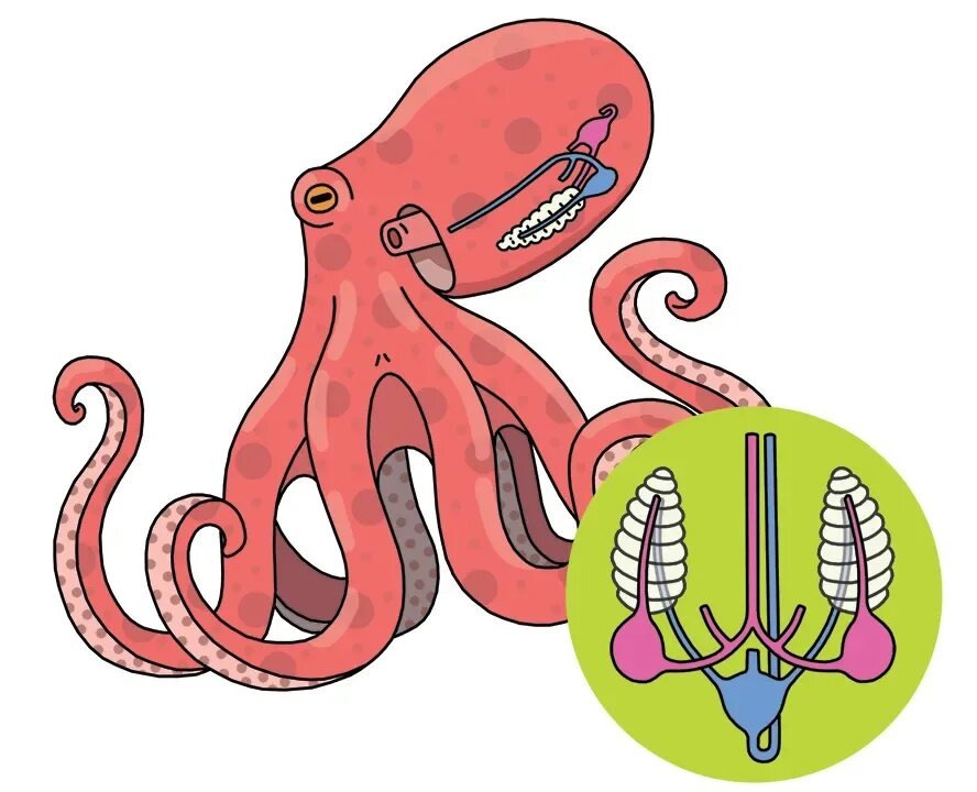 Мы часто слышим, что осьминоги - пришельцы из другого мира. Изучая их анатомию, начинаешь в это верить. Одно из самых удивительных доказательств - их система кровообращения, а именно три сердца. Давайте разберемся, зачем природа создала такую сложную конструкцию. Эти три сердца - не одинаковые копии, у каждого своя, очень важная задача: Получается эффективный конвейер: два «помощника» проталкивают кровь через жабры, а «босс» разгоняет ее по всему телу. Здесь мы подходим к самому интересному. Вся эта трехсердечная система работает на особом виде крови. Вместо гемоглобина, который придает крови красный цвет и основан на железе, у осьминогов гемоцианин - пигмент на основе меди. Именно медь делает кровь осьминогов голубой. И у этого есть эволюционный бонус: гемоцианин лучше работает в холодной воде с низким содержанием кислорода, позволяя осьминогам выживать в самых суровых условиях. Казалось бы, три сердца - суперспособность! Но у нее есть огромный минус. Жаберные сердца перестают битьс