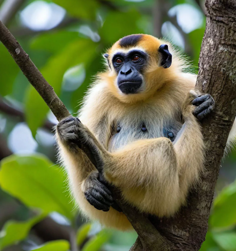 Гиббоны-лары выделяются своим элегантным внешним видом: контрастный бежево-черный мех и характерная белая "маска" вокруг лица. Эти грациозные создания мастерски перемещаются по кронам деревьев, издавая узнаваемые утренние крики. Рацион гиббонов включает тропические плоды, молодую листву, побеги растений, а также белковую пищу – насекомых, птичьи яйца и мелких животных. К сожалению, популяция диких гиббонов критически сократилась из-за браконьерства и разрушения естественных биотопов.