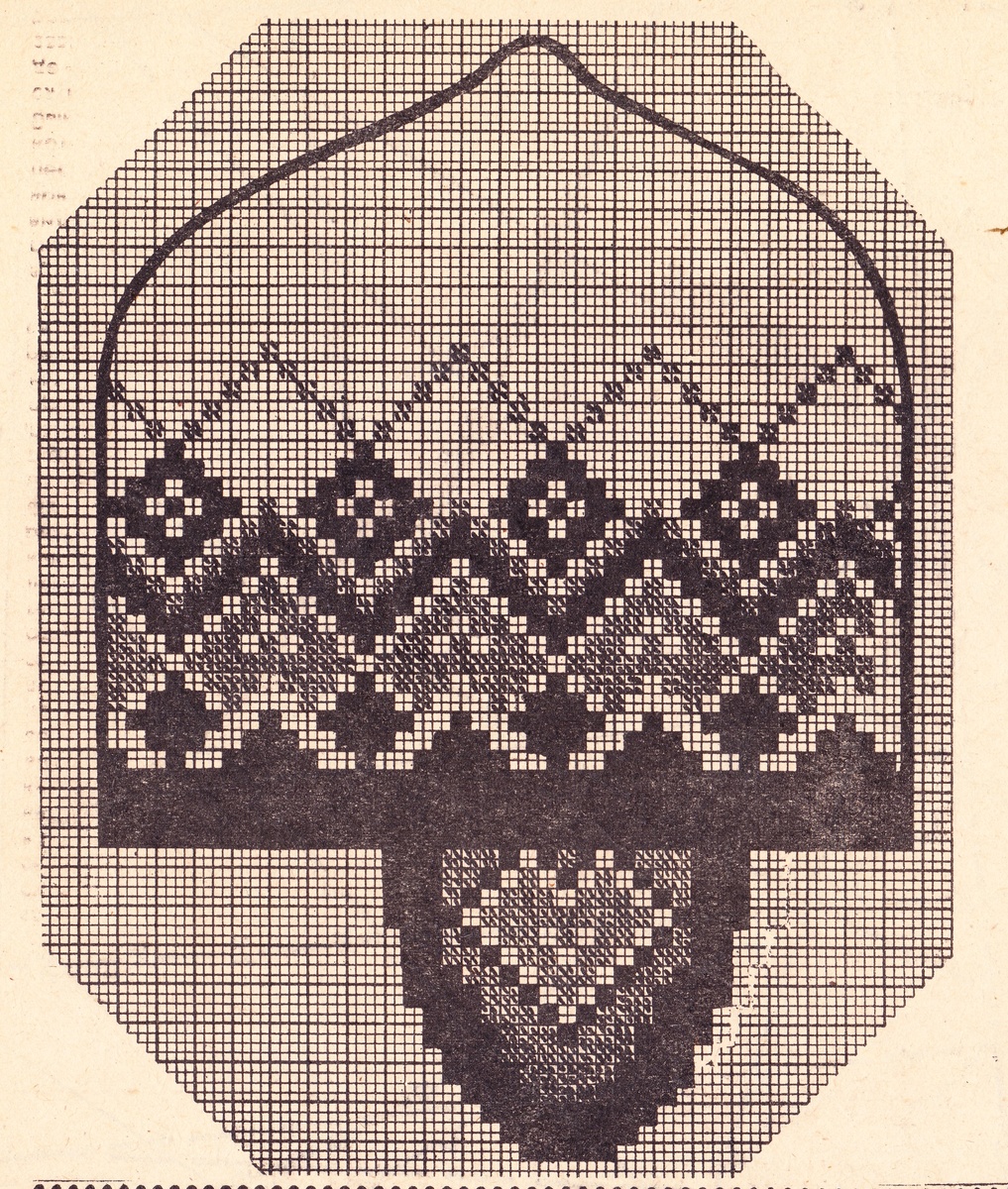 Шапочку с ушками по форме напоминающую шлем, вяжут из светлых ниток. Орнамент можно вывязать или вышить потом.