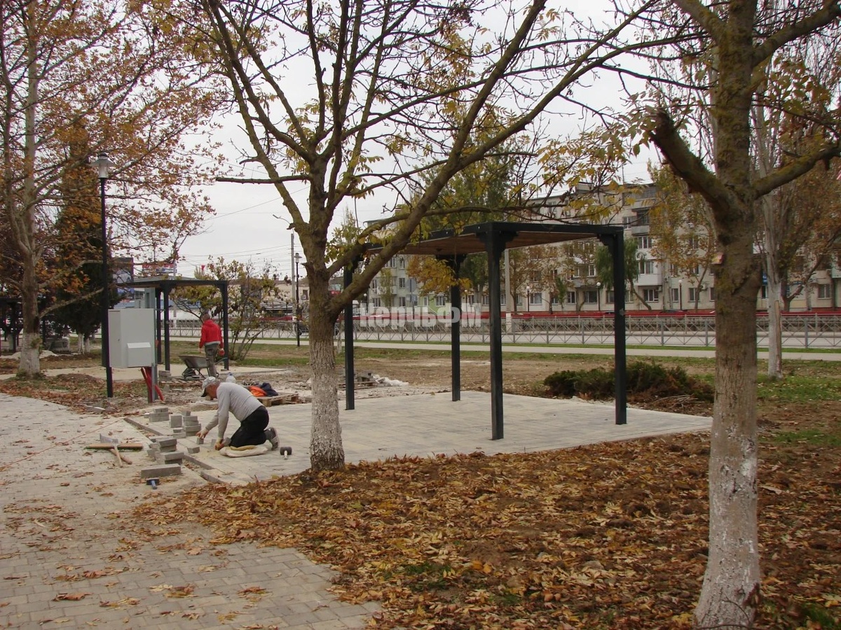 Под перголами в районе керченского РЭС укладывают тротуарную плитку