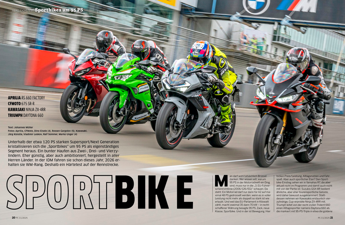 В рейтинге мотоспорта ниже мотоциклов Supersport/Next Generation, имеющих мощность около 120 л.с., 95-сильные «спортбайки» формируют отдельный сегмент. Они предлагают разнообразный выбор двух-, трёх- и четырёхцилиндровых двигателей. Относительно доступные, но при этом амбициозные, производятся по всему миру. Они уже участвуют в немецком чемпионате IDM, а в 2026 году получат право участвовать в Чемпионате мира. Отсюда и строгие испытания на гоночной трассе.