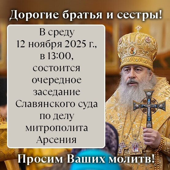 📅 На среду, 12 ноября 2025 г., назначено очередное подготовительное заседание Славянского горрайонного суда по делу наместника Святогорской Лавры митрополита Святогорского Арсения. 📌 Начало заседания в 13:00. Дорогие братья и сестры, просим молитв о заключённом митрополите Арсении и братии Лавры. Источник: Святогорская Лавра