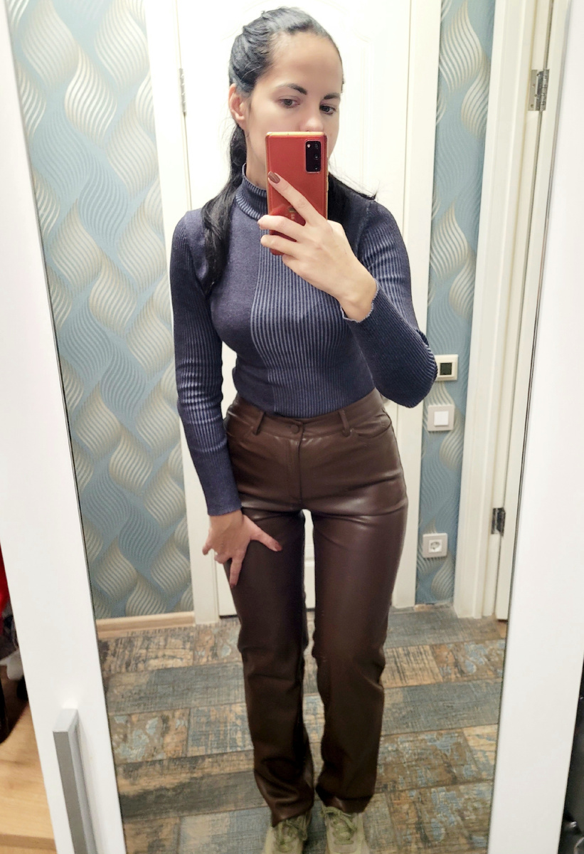 За последний год в ТОП самых популярных статей на этом канале почему-то вошли подборки моих покупок на маркетплейсах:) Хотите читать про шопинг, пожалуйста:) Подготовила очередную подборку своих недавних покупок за 3 осенних месяца, которые считаю наиболее удачными. Уже который год подряд я покупаю для холодного времени года кожаные брюки. Удобно: не промокают, а если попала грязь, достаточно просто протереть их влажной салфеткой. Этой осенью я выбрала классические прямые брюки шоколадного цвета из экокожи. Понравились фасон и материал - кожа плотная, утеплена изнутри. Хоть в описании товара и написано, что брюки демисезонные, они вполне подходят и для зимы. Купила здесь за 2057 рублей. Сейчас цена такая же:) Недавно столкнулась с небольшой дилеммой. Хотела не тонкую водолазку, которую, в том числе, можно носить и зимой, с оригинальным дизайном. Выбор в результате пал на фиолетовую облегающую модель из мягкого трикотажа с декоративными элементами в виде косички и небольшими вырезами