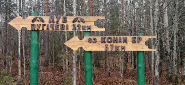 Проехав таблички к озеру Мушан-Ер, на изгибе можно увидеть указатели на наше озеро - Конан-Ер. Озеро расположено в заповеднике Марий Чодра. Вход платный, въезд запрещён и штраф от 3000 р. Авто можно поставить возле шлагбаума и отсюда дорога через 4 км приведёт к цели.