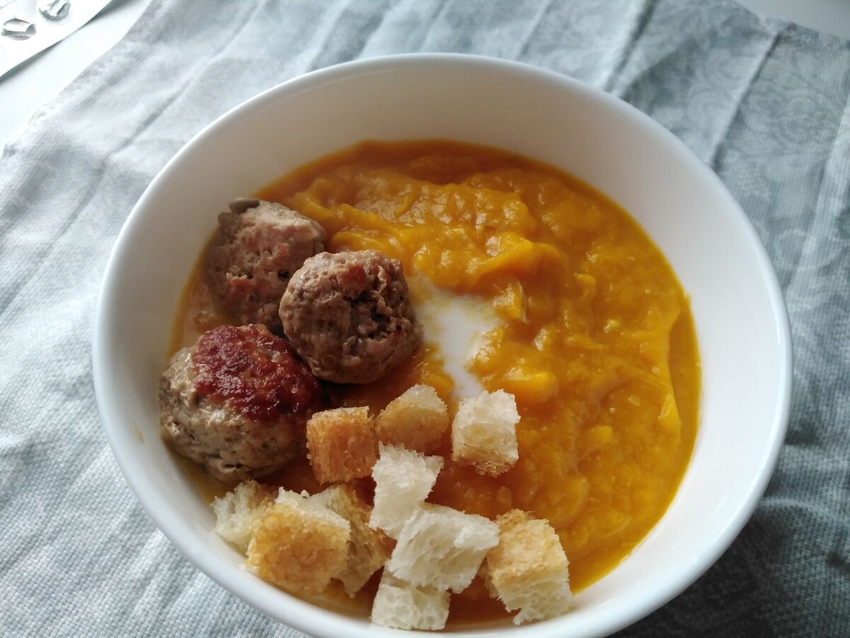 Всем привет! Ещё один вкусный рецептик тыквенного супчика в моей копилке есть и я спешу им с вами поделиться. • Тыкву, картофель, лук, морковь очищаем от кожуры и семян и нарезаем кубиками. • Перекладываем подготовленные овощи в кастрюлю и заливаем водой. Вода должна покрывать овощи. Солим и варим до готовности. • Пока овощи готовятся приготовим фрикадельки. Заранее приготовленный фарш солим, формируем из него шарики и отправляем на разогретую сковороду. Накрываем крышкой, периодически переворачиваем, доводим их до готовности. • Когда овощи станут мягкими, выключаем огонь. Сливаем половину бульона в отдельную ёмкость. Бульон частично оставляем, чтобы потом им регулировать густоту супа. • Перебиваем овощи погружным блендером до однородной массы. • Добавляем сливки, соль и перемешиваем. На этом этапе можно долить оставленный ранее овощной бульон и довести суп до приятной вам густоты. • Нежный, сливочный и в тоже время яркий супчик готов. Список продуктов, которые понадобятся для г