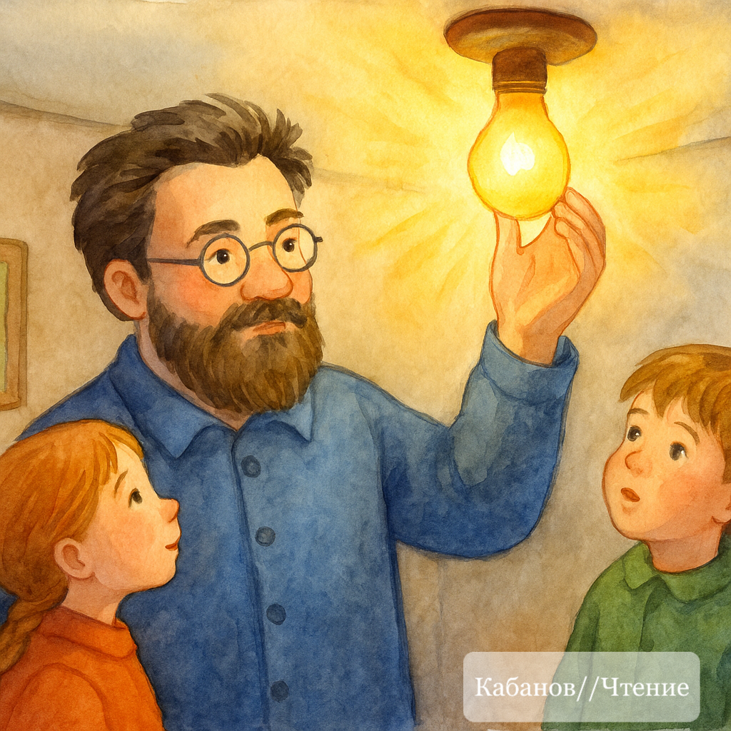Вечером, в субботу, в доме священника и учёного Павла Александровича Флоренского было тихо. И вдруг в гостиной погас свет. Павел Александрович поднял голову от книги, посмотрел на потолок и сказал спокойно: - Ну вот, лампочка решила отдохнуть. Сейчас поможем свету вернуться. Оля, принеси табуретку, пожалуйста.Оля принесла. Флоренский встал, осторожно поднялся на табуретку и открутил лампочку. - Перегорела, - произнёс он, как врач, ставящий диагноз. Дети обступили стол: Вася держал новую лампу, Кирилл светил свечой, а Оля внимательно наблюдала. Флоренский вставил новую лампу и щёлкнул выключателем. Комната вспыхнула мягким золотистым светом. - Вот снова день, - сказал он, спускаясь с табуретки. - Папа, а лампочка может устать? - спросил Кирилл. Флоренский улыбнулся: