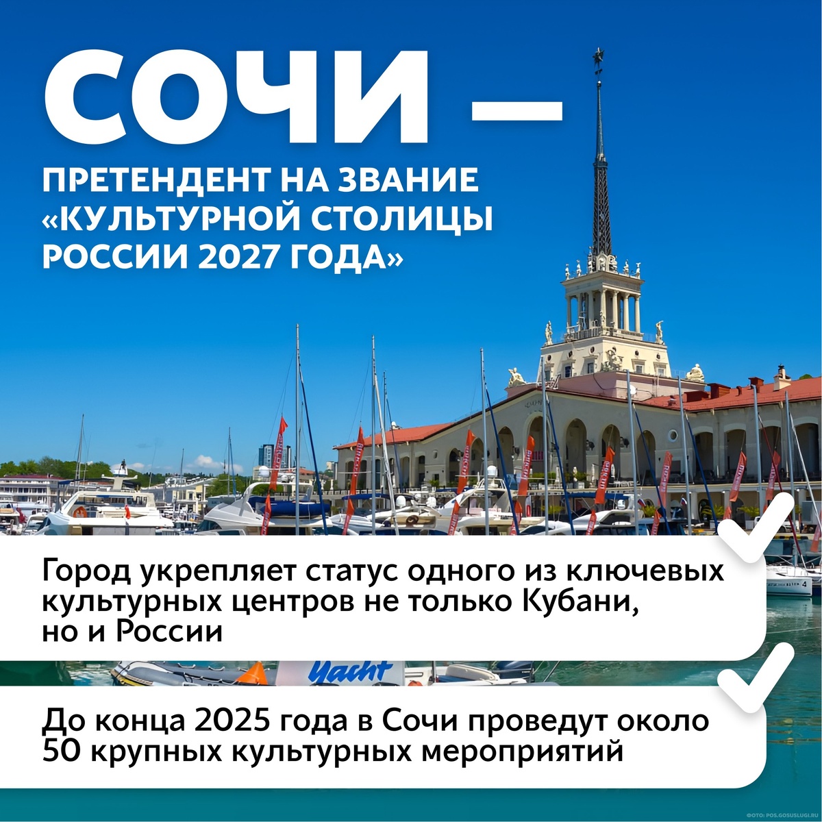 🎭 Сочи может стать официальной культурной столицей страны! 🔥 Сегодня Сочи — не только море и горы, но и богатая культурная среда. На сценах города выступают лучшие коллективы, а афиша насыщена событиями на любой вкус ❤️💭 Сейчас за победу в конкурсе борются 28 городов. За Сочи проголосовала почти 81 тысяча человек. 💡Поддержать город можно на «Госуслугах» до 5 декабря. 📍 Подробности по ссылке ➡️ https://vk.cc/cRaP3d 📍 Проголосовать можно на сайте ➡️ https://vk.cc/cKRwbD