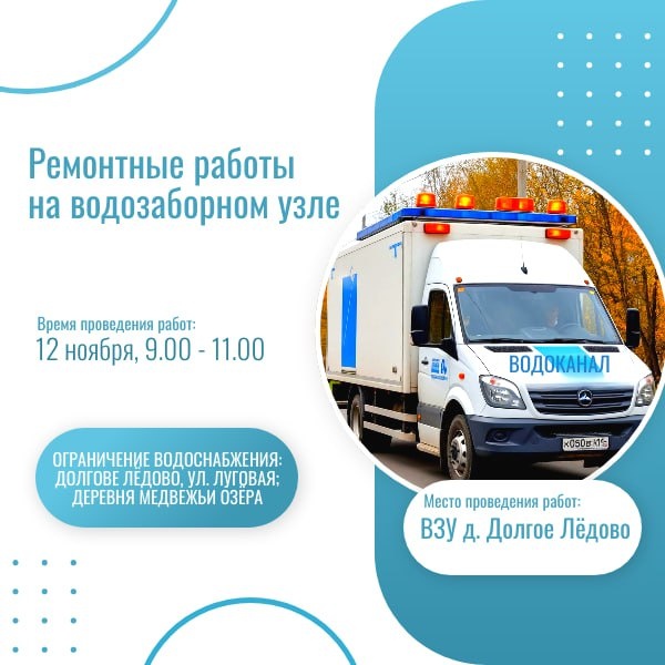 🛠 Аварийно-восстановительные работы на ВЗУ в Долгом Лёдове В связи с проведением аварийно-восстановительных работ на ВЗУ д. Долгое Лёдово будет отключено холодное водоснабжение 12 ноября, с 9.00 до 11.00, по адресам: ➡️ ул. Луговая, 1, 5, 11; ➡️ д. Медвежьи Озёра, 93, 97, 99, 99в, 101, 105, 109, 111, 113, 115, 117, 119, 123, 126в. Приносим извинения за доставленные неудобства. 📞Телефон аварийно-диспетчерской службы водоканала: 84965621172. Подписаться 🔹 Вакансии 🔹 Личный кабинет 🔹Чат-бот