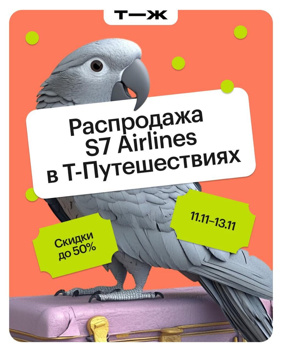 Почему наш попугай все еще не улетел в теплые края? Он просто ждал распродажу от S7 Airlines 🔥 🟢До 13 ноября у авиакомпании приятные скидки: можно сэкономить до 50% от цены. 🔴Ищите рейсы S7 Airlines через фильтр на сайте Т-Путешествий или в приложении банка. Они отобразятся уже со скидками. 🟣Участвуют внутренние и международные направления — только рейсы туда-обратно с вылетом после 17 ноября. 🟩 За билетами в новое путешествие